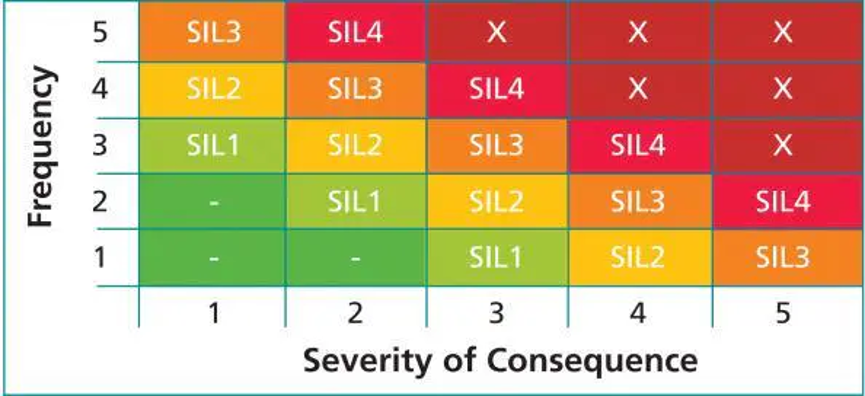 根據(jù)IEC標(biāo)準(zhǔn)的定義,有四個SIL級別(1-4)。 較高的SIL水平意味著更大的過程危害和SIS所需的更高級別的保護。 概括如何確定SIL水平,參見圖1。SIL水平是危險頻率和危害嚴(yán)重程度的函數(shù)。 可能更頻繁發(fā)生或具有更嚴(yán)重后果的危險將具有更高的SIL水平。
